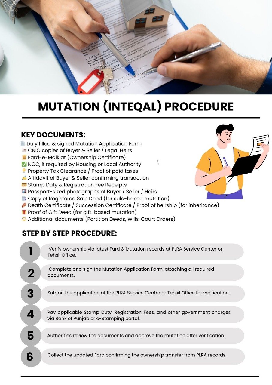 - Verification of Documents – CNICs, sale deed, Fard (ownership record), and registry checked.